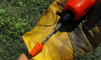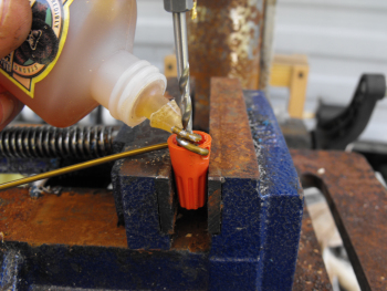 Cut a piece of wire about 7 inches long and insert one end through the hole in the wire nut. Curl the end of the wire around the drill bit securely.