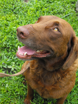 Lucy, our Chesapeake Bay RetrieverStill, it was the perfect dusky morning, just the time when deer like to travel.  I leashed Lucy, made sure the safety was on the gun, and headed off for our morning walk.  In the powerline cut, I startled another set of deer, but these two only ran a few feet and stopped.  I crept forward and the deer watched me but stayed put.  My second chance!