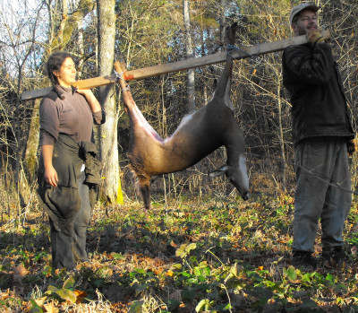 Carrying the deer home.I have to admit that at this point, my adrenaline was pumping so hard that I couldn't think what to do next.  So I made sure the safety was on the gun and ran home to my husband, waking him out of a sound sleep to come help me gut the deer, tie it to a board, and carry it home.